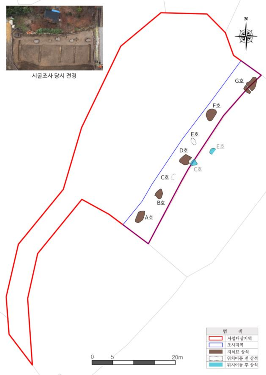 - E호 : 덮개돌의 평면형태는 반원형에 가깝고 규모는 284×210×55㎝이다.