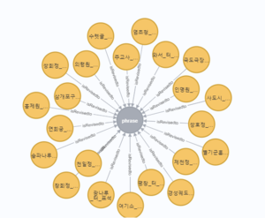 - 질의어: match (a:Correction) - [r:isRevisedto] - (b) - [t:isLocatedin] - (c:`Location_동`) - [p:isSubdistractOf]-(d) where a.name contains 'phrase' return d.name as 구이름, count (b) as 문구문제