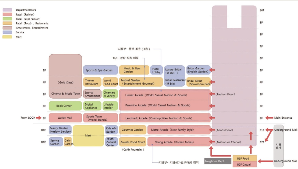 타임스퀘어의 초입에 있는 '백화점'은 전체 공간의 얼굴역할을 하며 전반적인 이미지를 형성하는 동시에 존재감을 드러낸다. 건축자는 디그니티(Dignity),럭셔리(Luxury),하모니(Hamony)라는 메인 키워드를 가지고 백화점을 설립했다고 설명한다. [4] 타임스퀘어 내 코트야드 바이 메리어트 서울 호텔은 영등포와 여의도 일대의 수요를 대상으로 설립되었으며 몰의 상부에 있기 때문에 상징성과 각 객실의 통일성을 중시하며 설립되었다. 따라서 입면에서부터 1층 출입구로 이어지는 캐노피를 통해 상징성을 표현하고 있다. 업무시설은 본질적인 목적을 충족시키면서 전체 공간과 조화롭게 어우러지도록 형태가 되도록 한 층을 두 개의 공간로 나누고 유리의 색이나 표현에 변화를 주어 정갈함과 은은함을 표현하고있다.