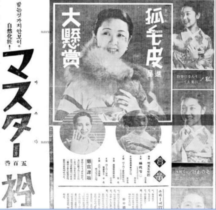 1935년 12월 26일 조선일보에 개재된 상미당의 백분 광고. '발는것가치안보이는(바른것같이안보이는)', '자연화장!'의 표현.