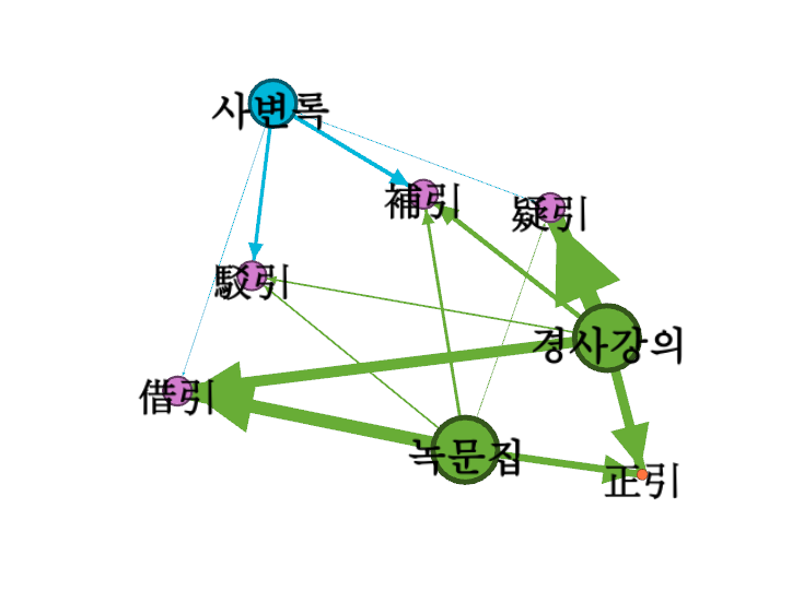 위의 시각화 결과를 보면, 1회만 인용된 문헌이나 인물들은 가느다란 선으로 멀리에 배치된 것을 볼 수 있다. 또 『사변록』과 『녹문집』, 『경사강의』에서 동시에 인용한 문헌은 세 책의 중간에 위치하는 것을 볼 수 있는데, 이 그래프를 통해 『논어집주』외에도 『주자어류』가 세 책에서 모두 인용되었다는 것을 알 수 있으며, 『녹문집』과 『경사강의』에서 동시에 인용한 문헌은 『논어』, 『사서대전』, 『맹자집주』,『근사록집해』가 있음을 알 수 있다. 인물간 인용 관계 역시 세 학자는 주희 외에도 정자와 사량좌를 공통적으로 인용했으며, 임성주와 정조는 모두 맹자와 윤돈을 인용했음을 알 수 있다.